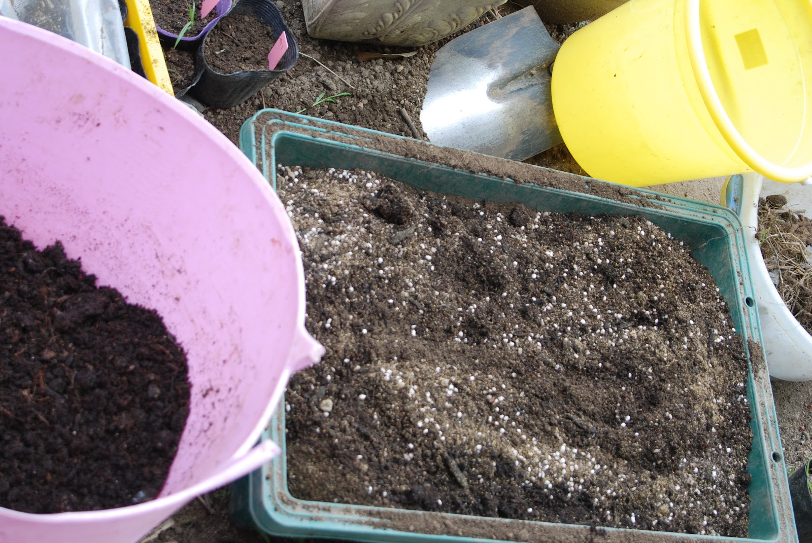 | 右の容器に2杯程の土を土掛けに用いた。 決めてはミミズ堆肥(左の容器)? |