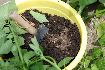 そして、狭い畝の間をバケツに土を入れて、ジャガイモ苗の根元に撒いていく。