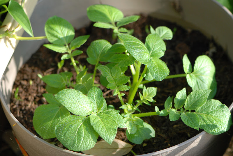 | こちらがみみず堆肥に植えたもの。種芋は二つ植えたはずだが、なぜか1個からは芽が出なかった。3本の芽が出ているので記念写真を撮ったあと2本は芽掻きをした。 |