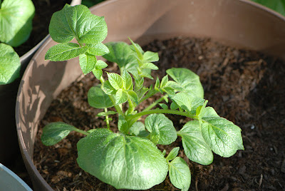 この時点ではどちらのプランターも2個種芋を植えたのに、なぜか1個づつしか芽が出ていなかった。