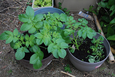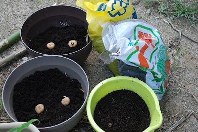 | 手前と奥のプランターに種芋を2個づつ植え、手前のプランターはバーク堆肥とバケツ一杯のミミズ堆肥。奥のプランターはバーク堆肥とミミズ堆肥と同等量の牛糞堆肥を入れた。 |