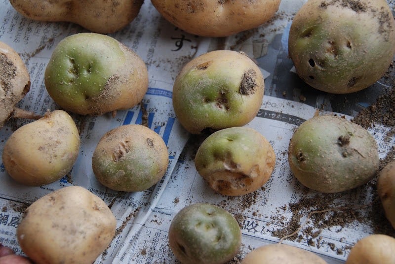 こちらは土寄せが不十分だったため光に当たったところに出来た緑化芋。