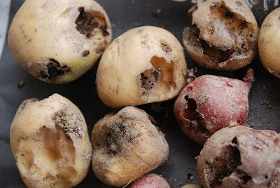 こちらは恐らく芋虫に食べられた芋たち。今日の芋掘りの時、土の中や芋苗の下の方に芋虫(ヨトウムシ?)を発見。土の中には数個のサナギも混じっていた。芋掘りの時期が遅れたらもっと被害が大きくなったに違いない。これら、食べれないと判断した芋達はさっそくみみず君の餌になる。