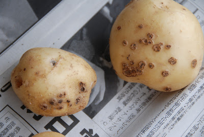 ジャガイモの病気のことは詳しくは知らない。調べてみると象皮病、皮目肥大、そうか病などといった病気の写真に近い気がする。