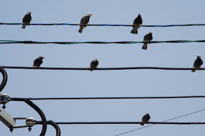| 畑の側の電線の五線譜の上ではムクドリたちが音楽を奏でている。 |