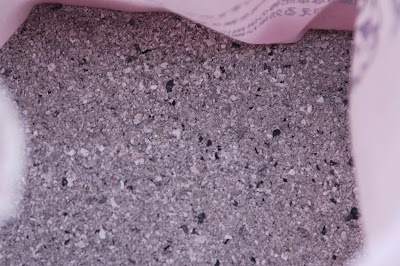 | 肥料袋に入れてある木灰。ピンク色に見えるのは袋のため。木灰は完全な灰色だ。 |