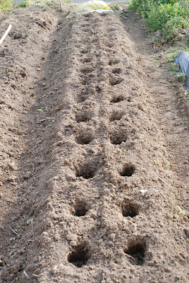 またジャガイモを植える時、溝を作って植えるやり方と、穴を掘って植えるやり方があるようだが、簡単そうだということで15cm深さの穴を掘る方式にした。