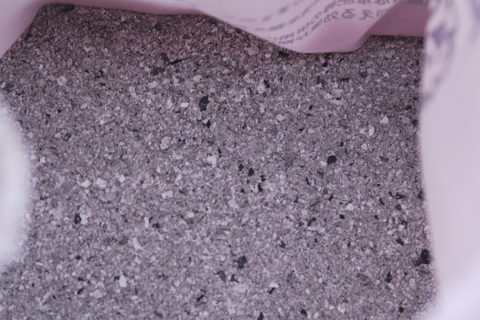 | 肥料袋に入れてある木灰。ピンク色に見えるのは袋のため。木灰は完全な灰色だ。 |