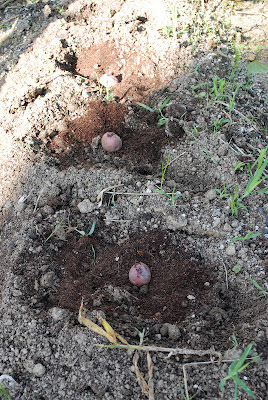 | ショウガの移植に失敗した畝の一部にはアンデス赤の種芋を3個植えた。 |