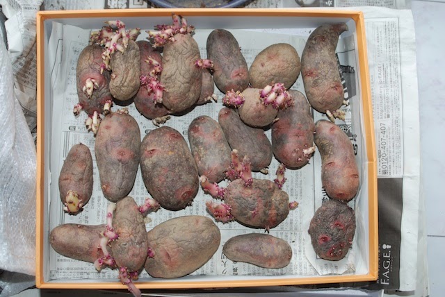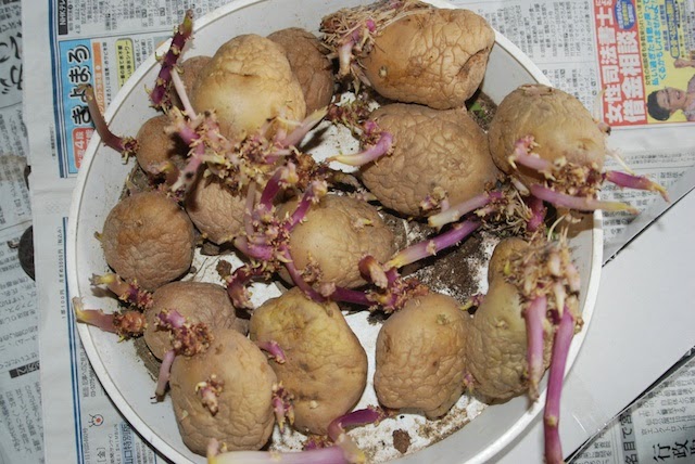下の写真で左の方に寄せた種芋。芽はしっかり出ている。しかしこの芋、シワシワでとてもうまく育つとは思えない。