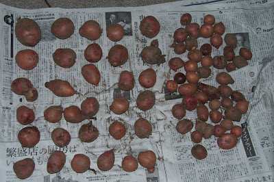 | 土嚢袋は3本とも収穫量は余り差がなかった。 土嚢袋と黄色のビニール袋の収穫量は一応満足だ。 子芋、クズ芋が多いのはアンデス赤の特徴だろうか? |