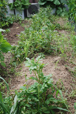 | 写真で分かりにくいが、畑から飛び出しているのは全部デストロイヤーの茎葉。 まだ紫の花が咲いているのも見える。 |