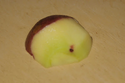 | 緑色というより赤っぽい皮にシミが付いている感じ。かなり分かりにくい。 |