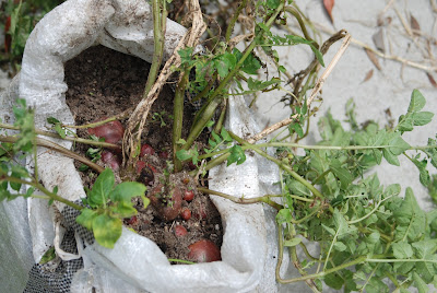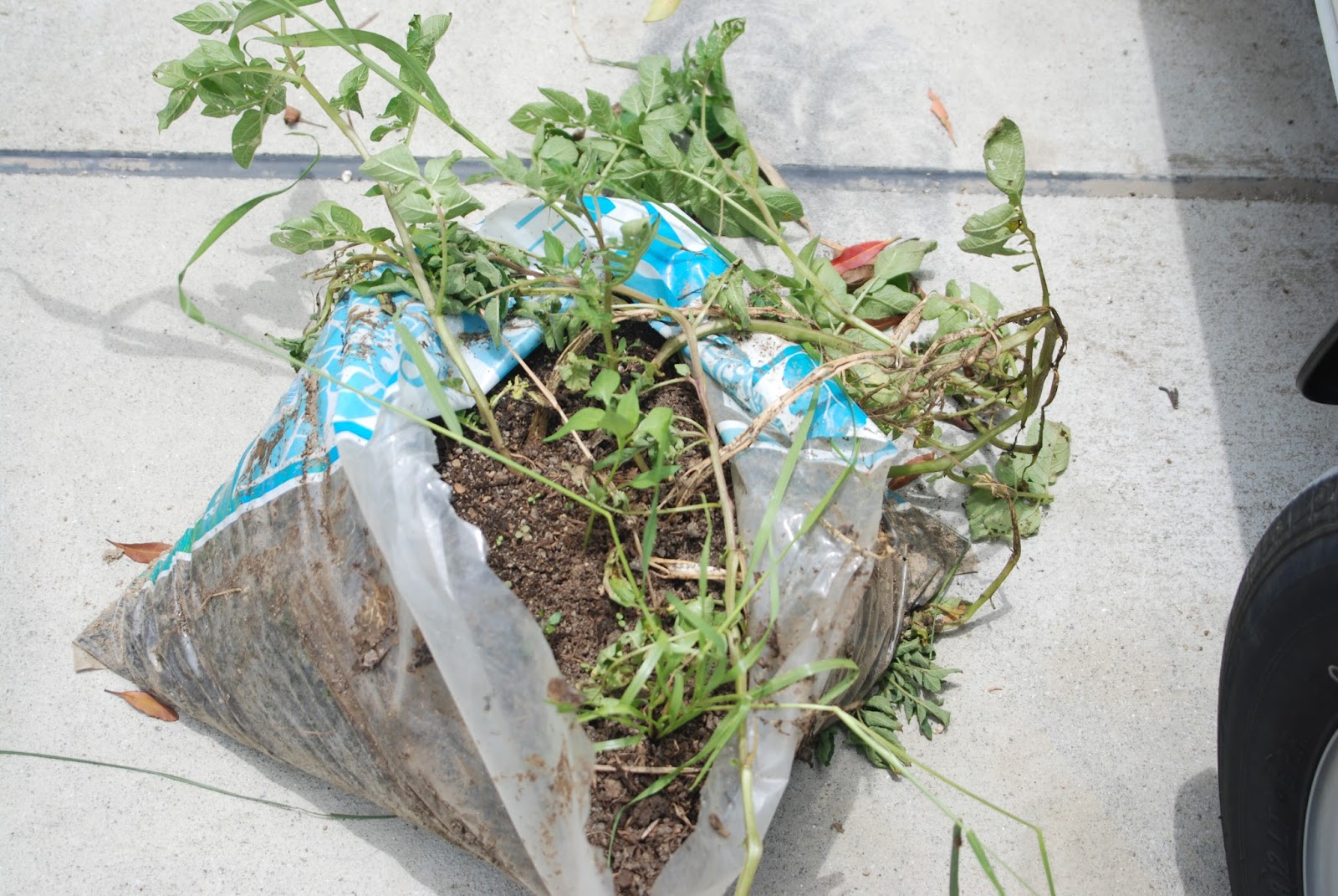 先日収穫した雑草の中の土嚢袋に植えた男爵芋の状況がよかったので