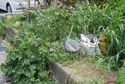 | 写真で分かりにくいが、畑から飛び出しているのは全部デストロイヤーの茎葉。 まだ紫の花が咲いているのも見える。 |