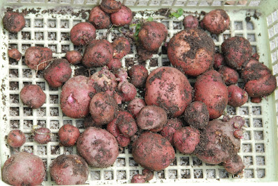 | 土嚢袋は3本とも収穫量は余り差がなかった。 土嚢袋と黄色のビニール袋の収穫量は一応満足だ。 子芋、クズ芋が多いのはアンデス赤の特徴だろうか? |