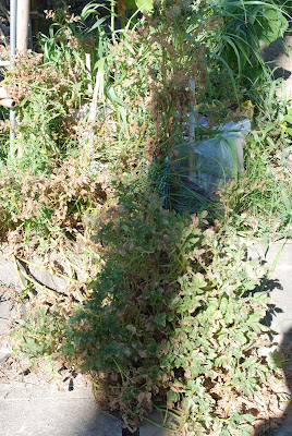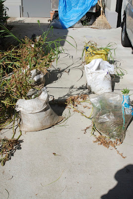 | ビニール袋に植えた茎葉は枯れ、透明な袋では茎葉は見えなくなっていた。 土嚢袋に植えた方が圧倒的に茎葉が茂っていたようだ。 |