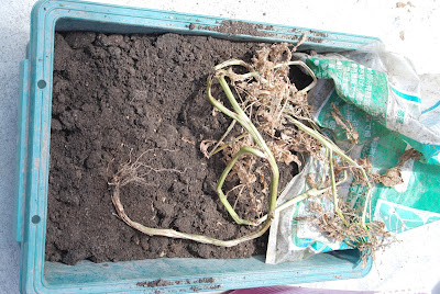 | ビニール袋に植えた茎葉は枯れ、透明な袋では茎葉は見えなくなっていた。 土嚢袋に植えた方が圧倒的に茎葉が茂っていたようだ。 |