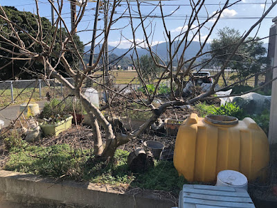 春になって伸びてくる枝の一部は、車庫の車に邪魔にならないように、また土嚢袋やプランターの野菜があまり弱らないように、さらに枝切りが必要になると思われる。