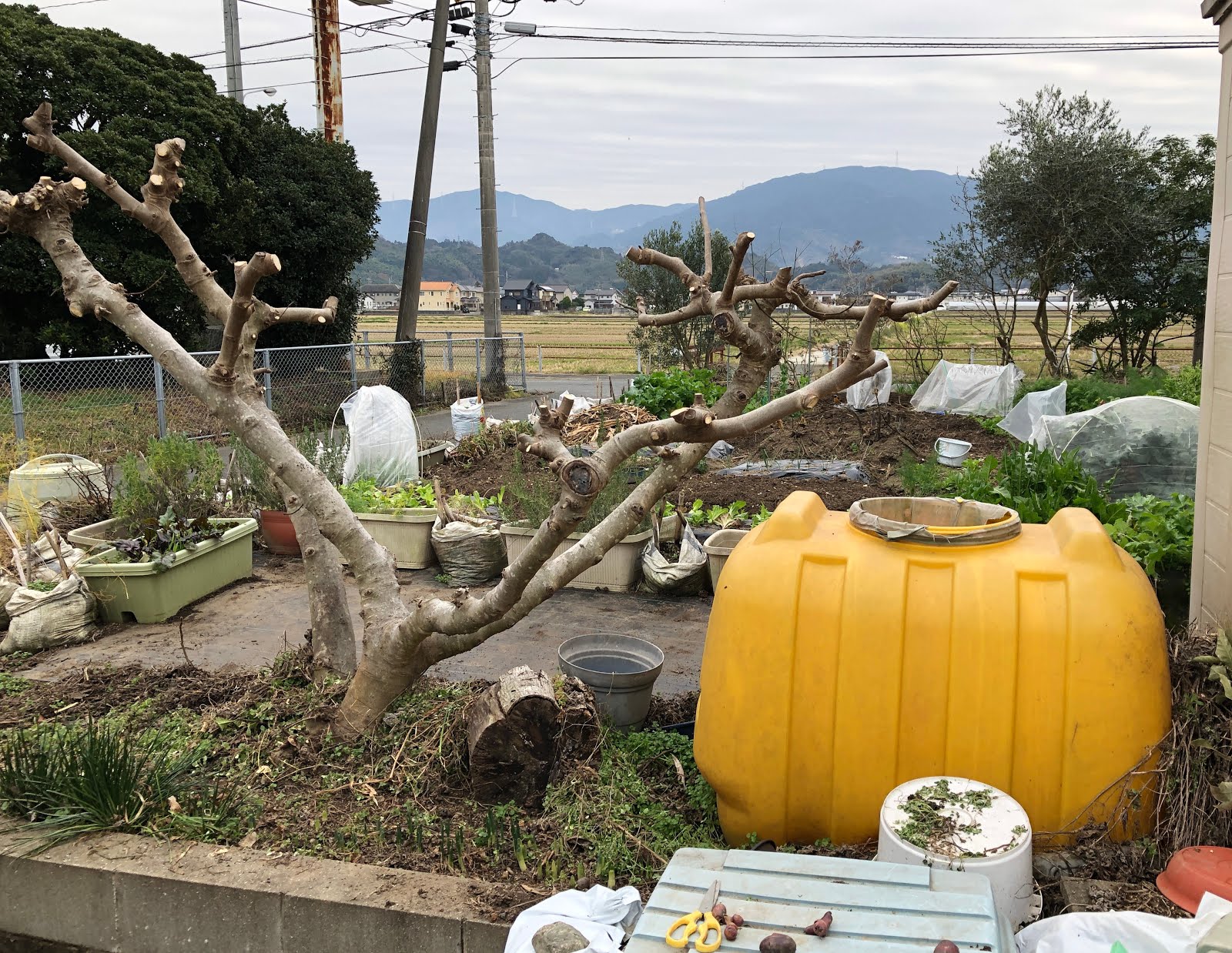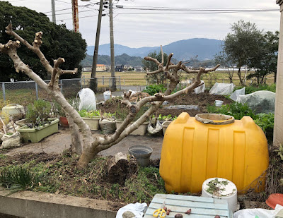 春になって伸びてくる枝の一部は、車庫の車に邪魔にならないように、また土嚢袋やプランターの野菜があまり弱らないように、さらに枝切りが必要になると思われる。