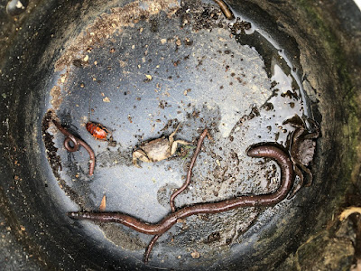 | ツグミはミミズ小屋の中の厄介者、水アブの幼虫をたくさん食べてくれた。 |