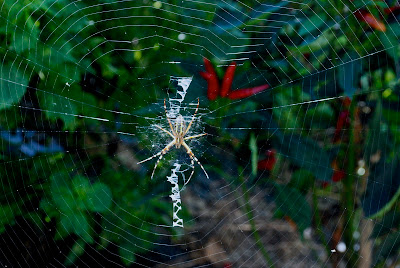 こちらは鮮紅色の紋があるので成熟したメスということだろう。ジョロウグモも微量の毒を持っているとのことだが噛まれて問題になることはないとのことだ。