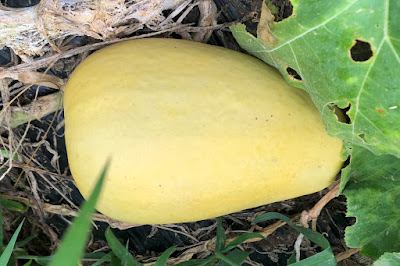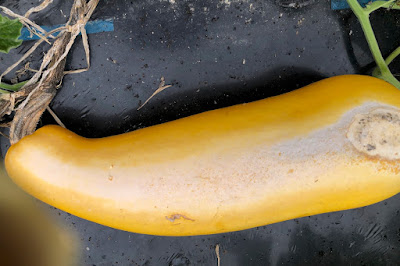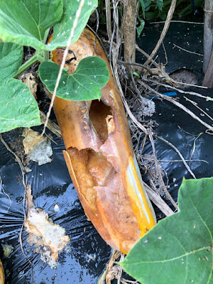 | 畑に残している白ズッキーニはこんな感じの実が3個。 こんな感じでこの時期に腐れるサインがない白ズッキーニは種取りは成功する。 ただ種取りをする時期は晩秋や翌年になることもある。 |