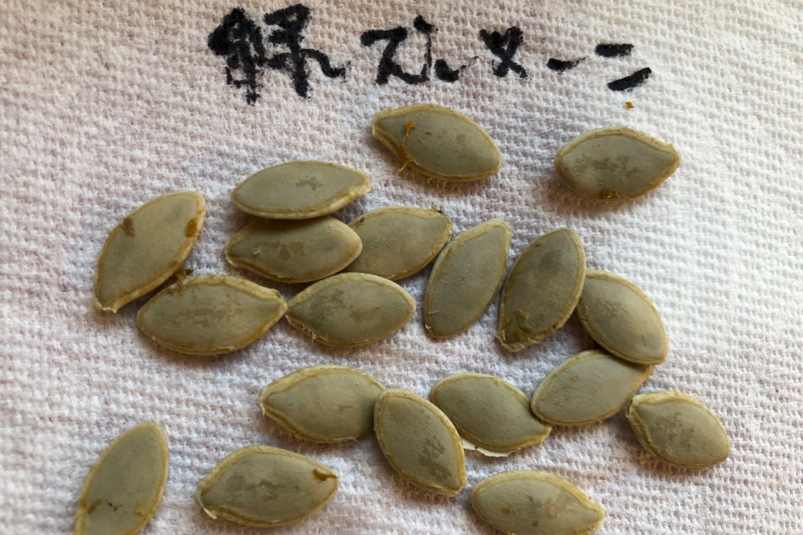 カボチャは完熟果を食べるので、食べる実から種取りができる。