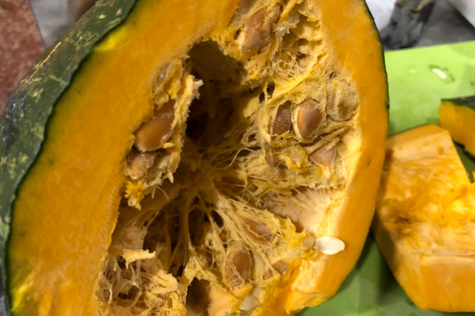 | カボチャの種取りは、腐れ始めた実からの収穫はあまりお勧めできない。 |