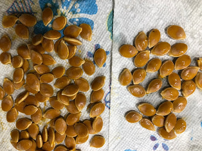 | 左が、料理中に取り出した種、右は取り出した種を一旦水で洗ったもの。 どう見ても、植えるときの条件には差は出そうにない。 |