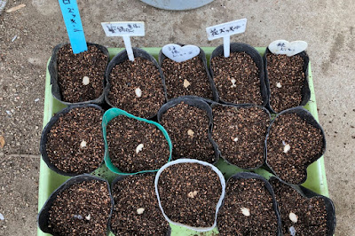 畝に蒔いた種は古くて芽が出ない可能性があるので、一応それぞれの種をポットにも植え付けている。