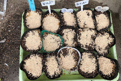 ポット種まきでの覆土は水の渇きが判断しやすい鹿沼土だ。