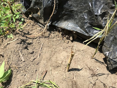 マルチを剥いでいくと、笹竹の芽があちこちに。 これが結構厄介者。 出来るだけ根深く掘り起こし根茎ごと取り除く必要があるのだ。 |