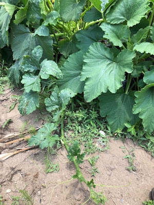 | こちらも白ズッキーニに似て葉は若干柔らかく、蔓で横広がりになる。 そして出来るのが細くて長めの実なので、用心しないと畝間を歩く時に潰してしまう。 |
