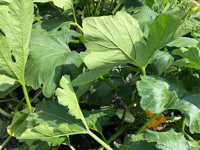 | UFO型ズッキーニの葉は白ズッキーニに似て柔らかい。 我が家では人気がないので、今年もプレゼント用に1株のみ育てている。 |