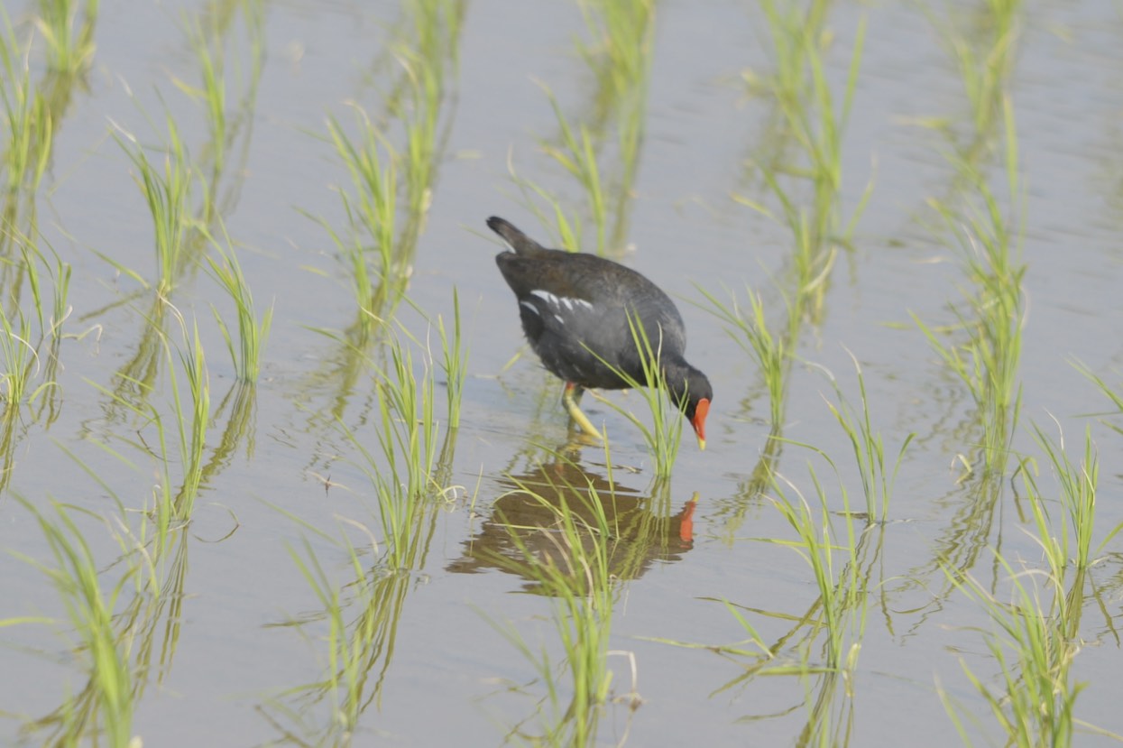 田んぼの中にアイガモを放す『アイガモ農法』というのがあるらしい。 雑草や害虫をアイガモに食べさせ、その糞は肥料になるとのことだ。 このバンも稲作にとってそんな益鳥なら嬉しいが。 |
