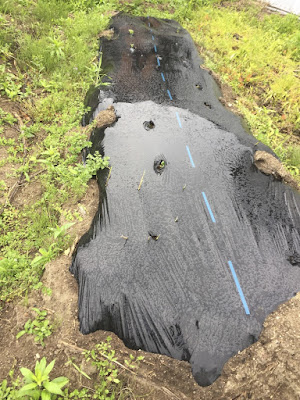 こちらの方は、最初からマルチに穴を開けていた。 種芋はこちらの方が小さなものが多かった。 |