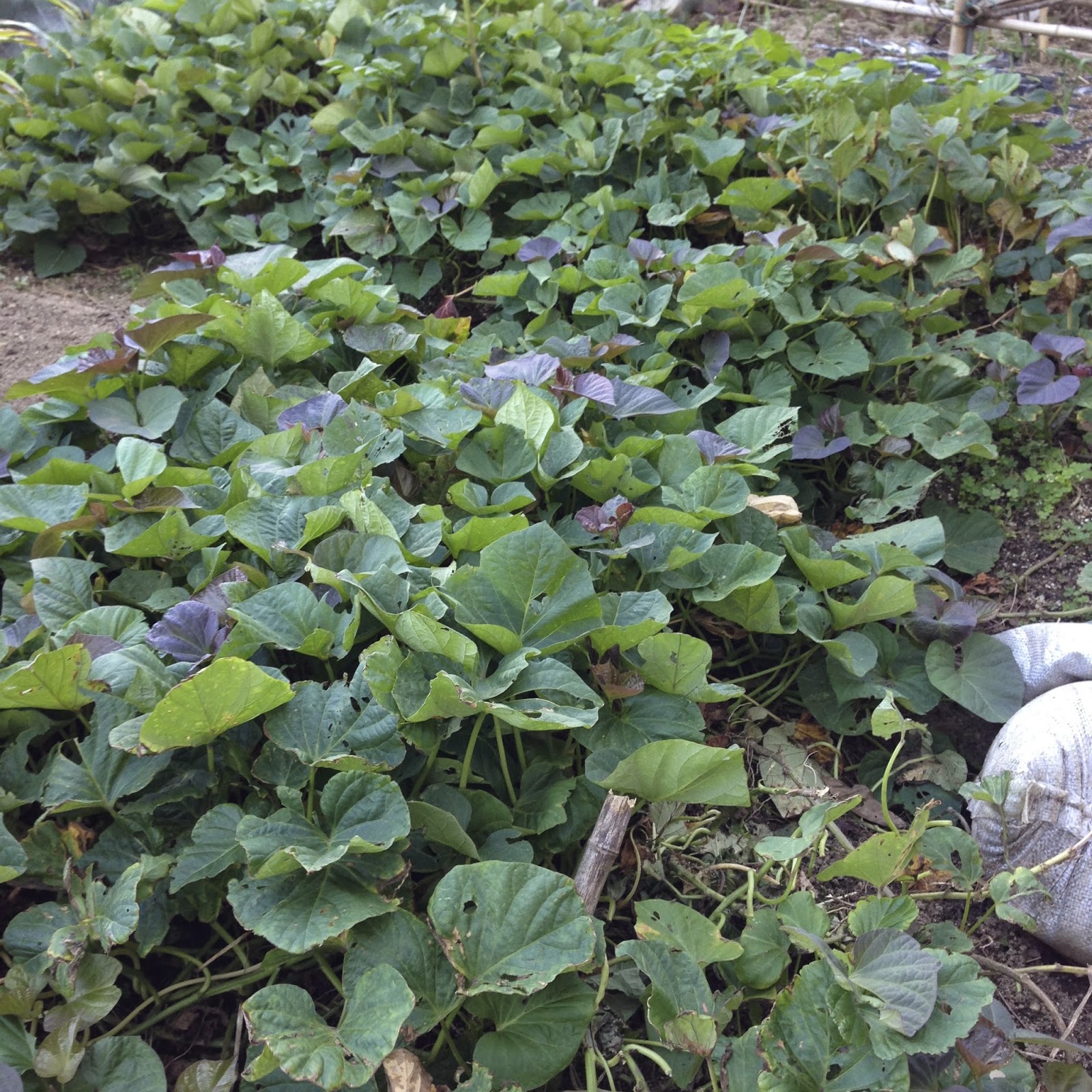 | こちらは安納芋を植えた畝。 まずまずの育ちになっているような気がするが試し掘りはもう少し先にしよう。 |