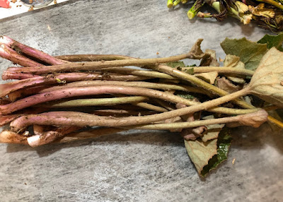 | ツワブキの皮むきは指が黒くなるので、若干申し訳なく思っている。 ただ、食べるその味は最高。 私は山菜の王様はツワブキだと思っている。 |