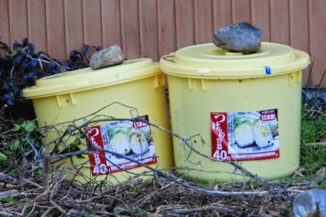 そこで、そこらここらに落ちているキクイモと雑草、そして大根首切り作業で出てくるたくさんの葉が、新しいコンポストでのミミズ君たちの第1回目の食事となるのだ。