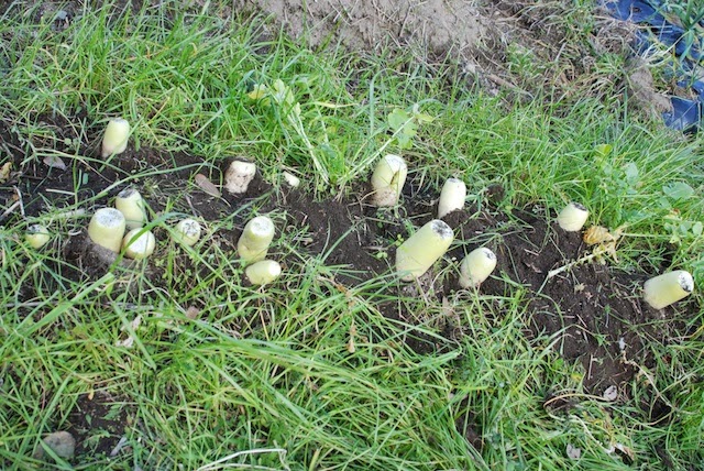 少し時間差で植えたこちらの大根も首切りの時期と判断し、同じ作業をおこなった。