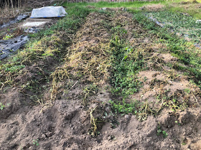 収穫が終わった場所から土をスコップで掘り起こして土寄せをした。 これで少しでもいい状態で防寒できればと思っている。 もし1月掘り返す芋から芽が出てきているようならこの試みは失敗だ。 |