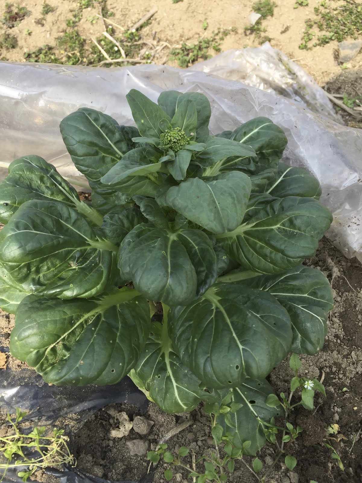 ところで、最初に種を蒔いて虫被害が甚大だったターツァイも捨てるのはもったいなかったので、冬の時期不織布をかけて放置していた。