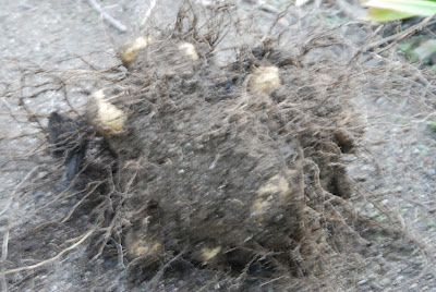 | 写真は塊になった芋が引き抜け、それをひっくり返した所。 多くの芋が土と一緒に団子状態。芋は傷ついていない。 |