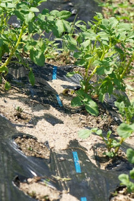 さて、第2菜園の方に寄ってみると、2週間程前デストロイヤーの種芋が腐れて居るのに気付いて種芋を植え直したところに、やっと小さな芽が見えてきた。