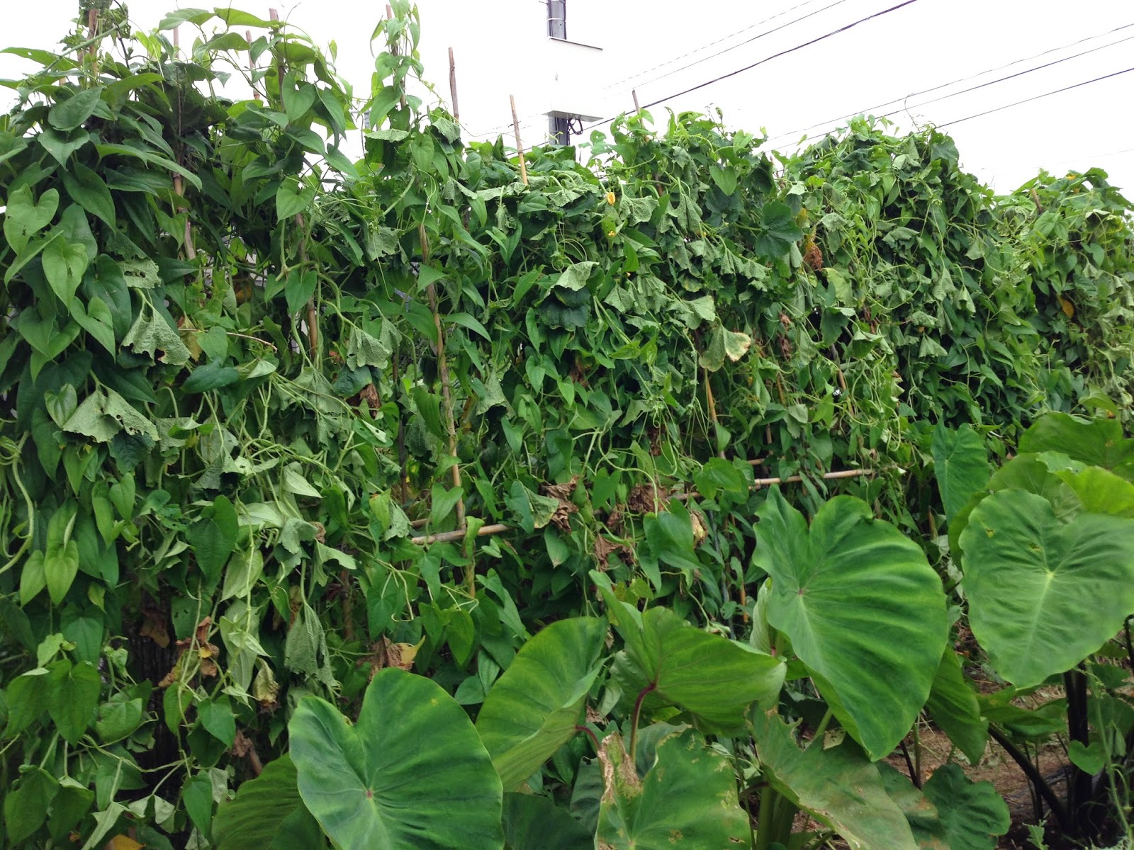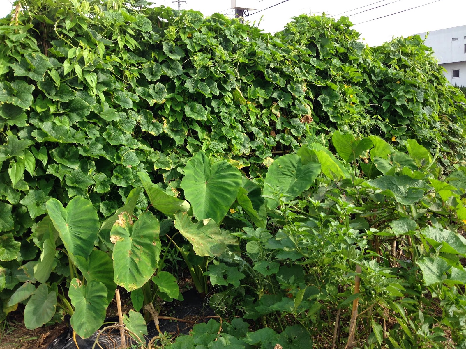 | ツクネ芋の支柱にはびっしり茂った蔓葉で大きな壁のようになっている。 只、そこに見えているのは冬瓜の葉ばかり? |