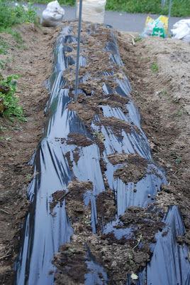 | 芽が出るのは恐らく5月中旬。それまで風でマルチの位置がずれないように土をかけておいた。 あとは芽が出てきたら支柱を立てることになる。 昨年は最初立てた支柱が台風が近づいた時倒れた。今年は同じ轍は踏まないつもりだ。 |