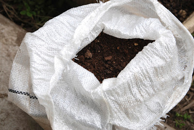 | ミミズ堆肥と腐葉土、牛糞堆肥などを適量混ぜ、これを種芋周囲と上にに入れこむ。 |
