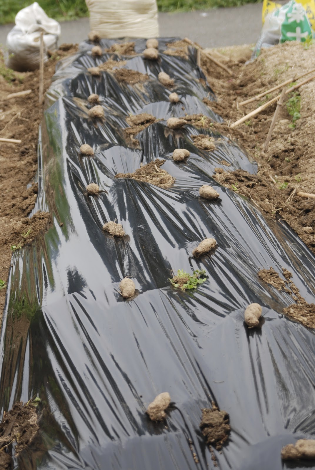 下の写真はマルチを掛けた畝の上で、目印となる盛り上がりのあるところに種芋を置いたところ。