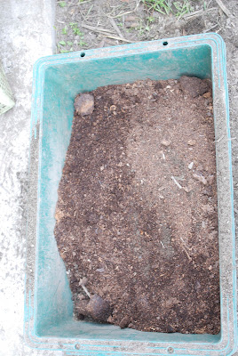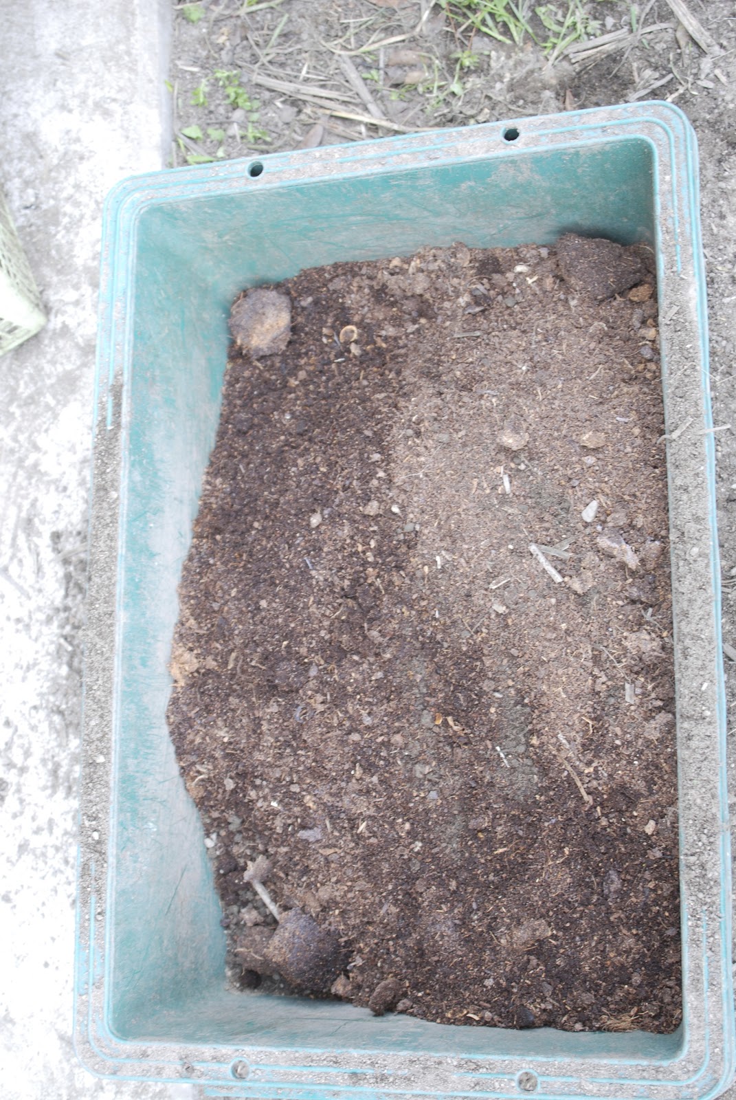 | ミミズ堆肥と腐葉土、牛糞堆肥などを適量混ぜ、これを種芋周囲と上にに入れこむ。 |
